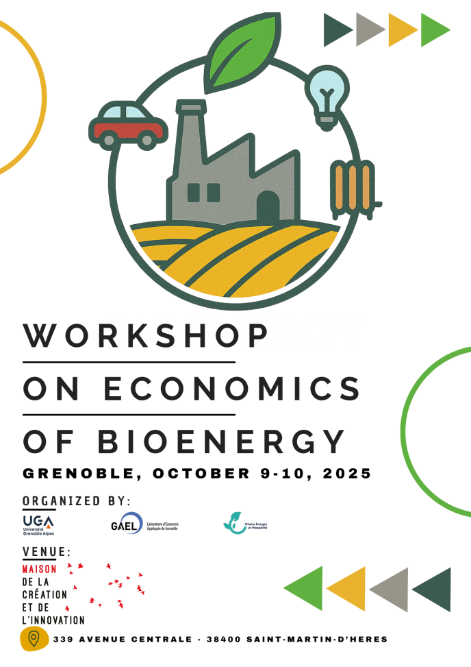 The Grenoble Applied Economics Laboratory and the Energy and Prosperity Chair are organizing a workshop on the "Economics of Bioenergy" on Thursday, October 9, and Friday, October 10, 2025, on the campus of Université Grenoble Alpes, France.